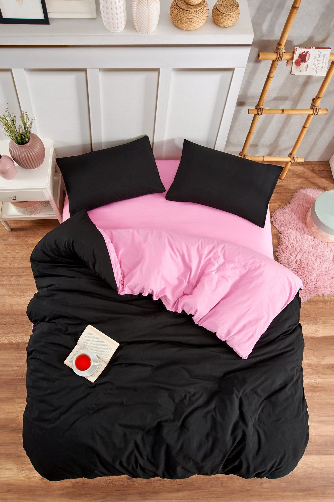 Pamuklu Nevresim Takımı Lastikli Çarşaflar Tek ve Çift Kişilik Seçenekli Siyah Pembe