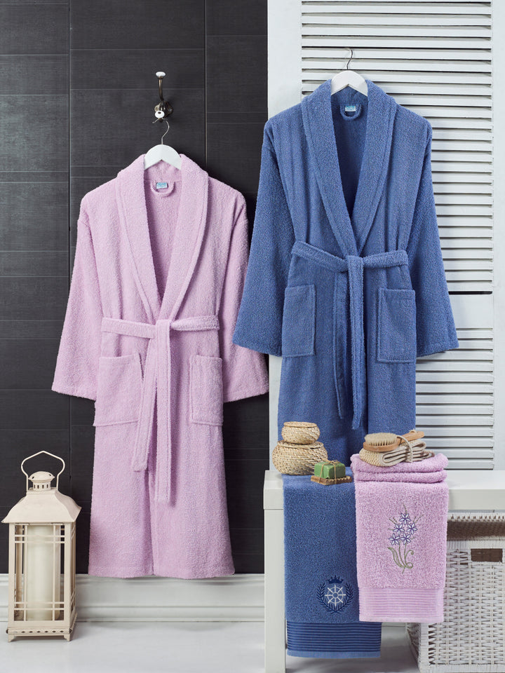 Leylak Lacivert Havlulu Bornoz 4'Lü Set